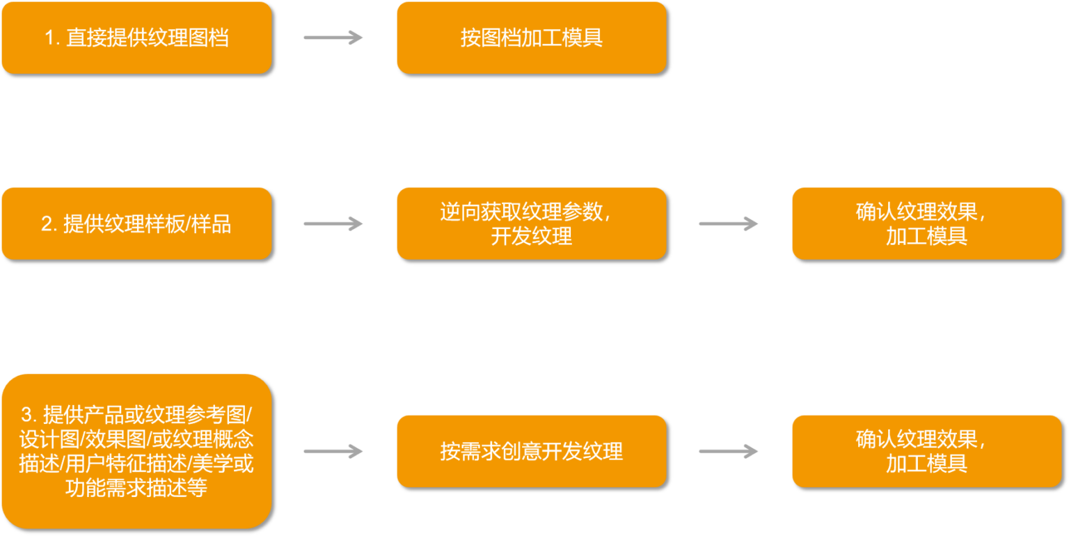 为了确保客户能够直观地评估,和检验产品的纹理效果,我们可以提供两种高质量的样板,用于纹理的视觉检查、质感评估以及初步的功能性测试,如色彩、光泽度、手感、抗刮擦效果检测等:平面样板—— 采用高品质塑料材料、通过精密注塑成型工艺制成,可以完美展现产品的纹理细节。异形简易模样板——根据产品实际造型设计并制作,通过注塑成型工艺制成,可以把纹理效果直接体现在产品上。